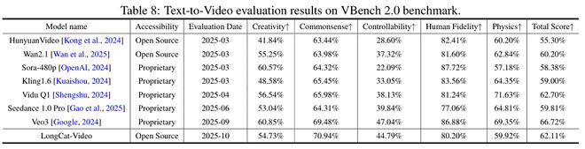 在公开评测平台VBench 2.0上,LongCat-Video在“常识理解”一项中以70.94%的得分位居所有开源模型第一,总分达到62.11%,仅次于谷歌Veo 3与生数Vidu Q1等商用闭源模型。
