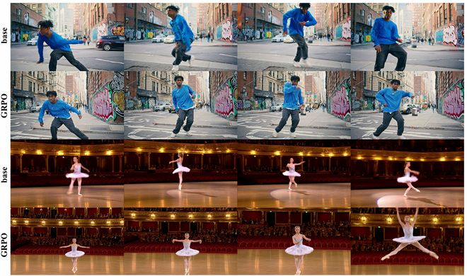 这种多维度的奖励设计让模型在强化学习阶段能够平衡地提升表现,避免过度优化单一指标而导致画面僵化或运动失真。