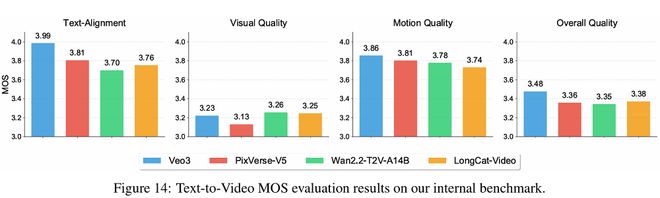 在内部评测体系中,美团构建了一套覆盖文本生成视频与图像生成视频两大核心任务的基准,评估维度包括文本对齐、视觉质量、运动质量与总体表现,并在图生视频任务中额外增加了图像一致性指标。
