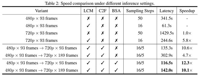 在高效推理方面,LongCat-Video通过一系列工程创新显著提升了生成速度与分辨率。团队采用“粗到细”的生成策略,先快速生成低分辨率、低帧率的视频,再由LoRA微调的精化模块进行高清复原,最终可输出720p、30帧的成片。